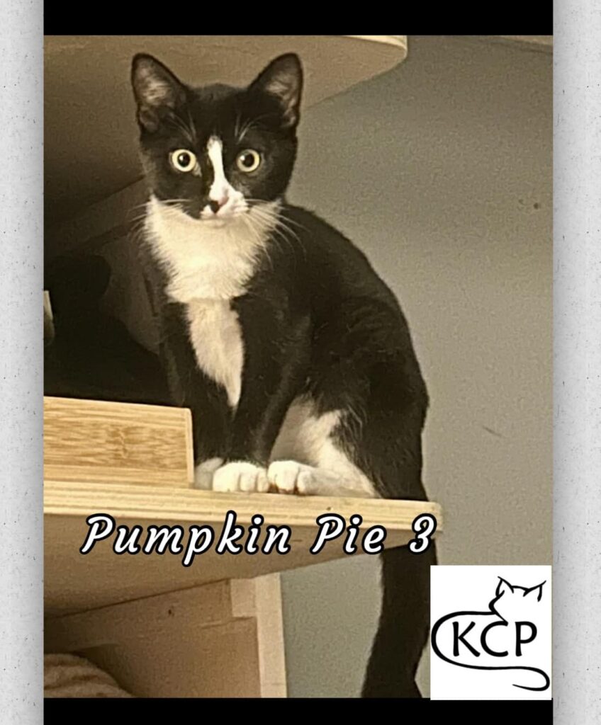 PUMPKIN PIE 3 – Approx. 14 weeks old – Male Hi! Who doesn’t love a black cat with white socks and markings?! I am a healthy, curious, happy kitty. I am still just a little bit shy and like a slow approach and calm soft voices. I love lots of pets with food, love wand toys, love exploring and climbing and looking out windows and the big wide world. I am really curious and will often come watch what you are doing. I will come for treats or food. Sometimes I play hard to get; On the other hand, my fosters like to hold me in their arms, cradled like a baby, and I kind of like it too, even with gentle tummy pets. I like being around people now and hope to find my forever home and family soon. I have seen other cats and dogs while in foster and played with an adult cat lots!